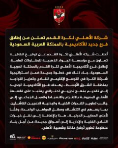 أعلنت شركة الكرة بالنادي الأهلي عبر الصفحة الرسمية للنادي على مواقع التواصل الإجتماعي، عن إطلاق فرع جديد للأكاديمية داخل المملكة العربية السعودية، وذلك بالتعاون مع شركة الجواد الذهبية للمقاولات العامة، في إطار تطوير منظومة واستراتيجية الأهلي، وتعزيز التواجد في المنطقة العربية والشرق الأوسط.