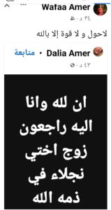 وأعلنت داليا عامر شقيقة وفاء وأيتن عامر عبر حسابه الرسمي على موقع التواصل الإجتماعي، عن وفاة زوجها وكتبت: «إنا لله وإنا اليه راجعون توفي الي رحمه الله اللواء حسني علي كامل الرزاز ابو اولادي اسر حسني علي وملك حسني علي وفريده حسني علي وآدم حسني علي برجاء الفاتحه والدعاء بالرحمه».