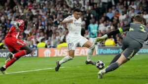 قبل نهاية الشوط الأول، قاد البرازيلي فينيسيوس جونيور هجمة من الجانب الأيسر، وتوغل إلى منطقة جزاء فريق البايرن، ومرر كرة أرضية إلى كيليان مبابي، الذي سجل الهدف الثالث لصالح الضيوف، لينتهي الشوط الأول بتقدم الريال بثلاثية مقابل هدفين.