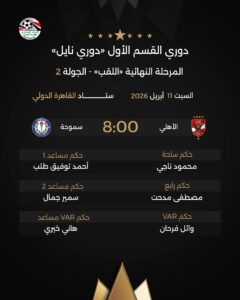 دوري نايل.. طاقم تحكيم مباراة الأهلي وسموحة غدًا في الجولة الثانية من مرحلة الحسم
