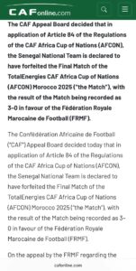 أعلن الموقع الرسمي للاتحاد الأفريقي لكرة القدم “الكاف”، عن تحويل مسار كأس الأمم الأفريقية من يد السنغال بعد الفوز في المباراة النهائية بهدف دون مقابل، ومنحه للمنتخب المغربي، واعتبار المنتخب السنغالي منسحبا من المباراة، ومهزوم بنتيجة 3–0، وذلك بناءًا على قرار لجنة الاستئناف داخل الاتحاد الأفريقي.