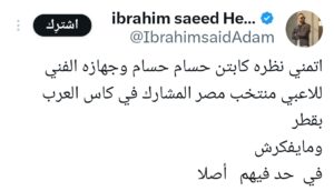 سخر إبراهيم سعيد لاعب المنتخب المصري السابق من منتخب مصر المشارك في بطولة كأس العرب بقيادة المدرب حلمي طولان، قائلًا: “‏أتمنى نظرة كابتن حسام، وجهازه الفني للاعبي منتخب مصر المشارك في كاس العرب بقطر، ومايفكرش في حد فيهم أصلا.”