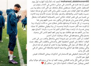 جاء نص بيان محمد عبد المنعم مدافع الأهلي السابق وفريق نيس الحالي، على النحو التالي: الحمد لله دائماً وأبدا انهارده اول يوم تمرين ليا بعد فتره هي الاصعب في حياتي دخلتني في اكتئاب وتوتر من المستقبل خلتني اشوف مستقبلي بشكل مختلف عن اللي كنت بحلم بيه”.