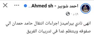 وكتب شوبير عبر صفحته الرسمية على موقع التواصل الإجتماعي «فيسبوك» أن اللاعب حامد حمدان أتم انتقاله إلى صفوف بيراميدز، وسوف ينتظم في تدريبات الفريق غدًا الأربعاء.