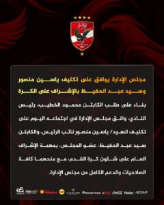 يذكر أن مجلس إدارة النادي الأهلي بقيادة محمود الخطيب، وافق على تكليف ياسين منصور وسيد عبد الحفيظ بالاشراف الكامل على ملف كرة القدم بالنادي، مع منحهم كافة الصلاحيات والدعم الكامل خلال الفترة المقبلة.