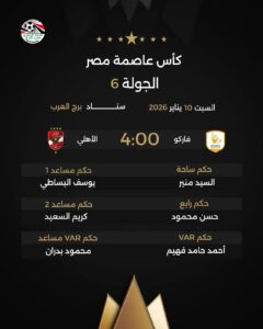 يحل فريق الكرة بالنادي الأهلي ضيفا مساء اليوم السبت على نظيره فريق فاركو السكندري، وذلك في إطار مباريات الجولة السادسة من بطولة كأس عاصمة مصر، في المباراة التي ستقام على ملعب برج العرب بالإسكندرية.
