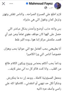ونشر محمود فايز مدرب المنتخب المصري السابق في عهد كوبر، والمحلل الرياضي بقنوات أم بي سي مصر قائلا: “لازم اطلع على المسرح الصراحة… والناس تقلش وتهزر وتزعل كمان وتقول اللي هي عايزاه