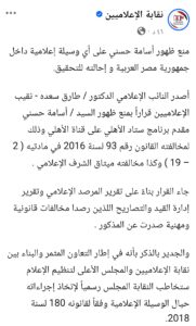 “أصدر النائب الإعلامي الدكتور / طارق سعده — نقيب الإعلاميين قراراً بمنع ظهور السيد / أسامة حسني مقدم برنامج ستاد الأهلي على قناة الأهلي وذلك لمخالفته القانون رقم 93 لسنة 2016 في مادتيه ( 2 – 19 ) وكذا مخالفته ميثاق الشرف الإعلامي .